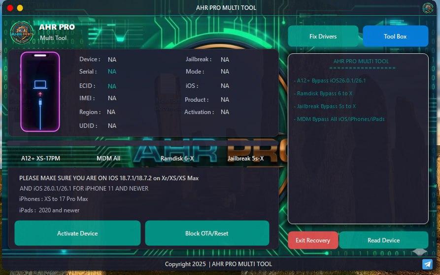 AHR PRO Multi Tool A12+ Activator SIGNAL Bypass 18.7.2 iOS Supported Xr Xs XsMax Win or mac